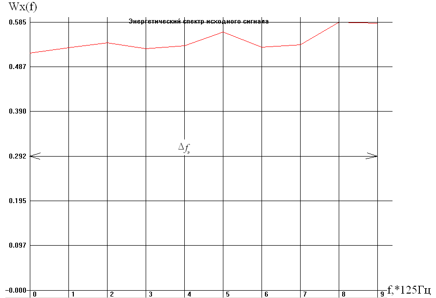 Корреляционная функция R>х>(t) и энергетический спектр W>x>(f) исходного сигнала изображены на рисунках (см. ниже). Это широкополосный сигнал. Т = 0.0004с; N>1> = 10;