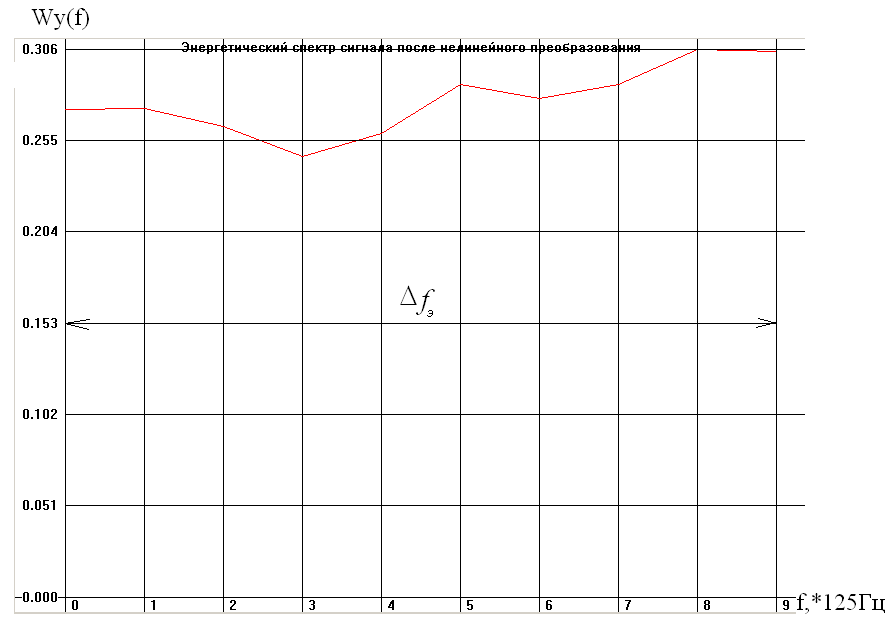 В результате преобразования случайного процесса X(n) в безинерционной нелинейной цепи, случайный сигнал перестал быть равномерным. Математическое ожидание увеличилось и стало больше 0, среднеквадратичное отклонение уменьшилось примерно в 1,5 раза. Сигнал остался широкополосным, >к> и f>э> остались прежними.