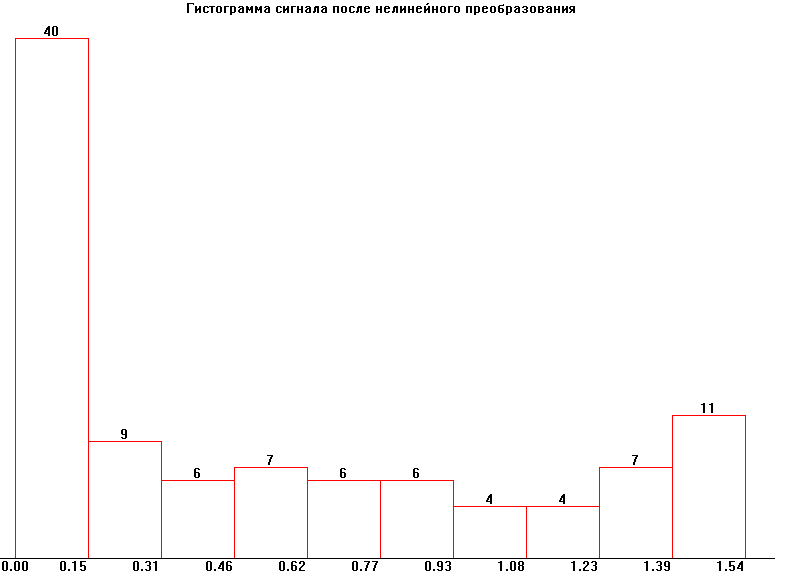 В результате преобразования случайного процесса X(n) в безынерционной нелинейной цепи случайный сигнал перестал быть равномерным. Математическое ожидание увеличилось и стало больше нуля. Среднеквадратичное отклонение уменьшилось примерно в 1,5 раза. Сигнал остался широкополосным.