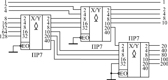 Для преобразования двоичных кодов от 0 до 255 требуется три микросхемы ПР7 (рис.2.), которые необходимо каскадировать для увеличения разрядности.