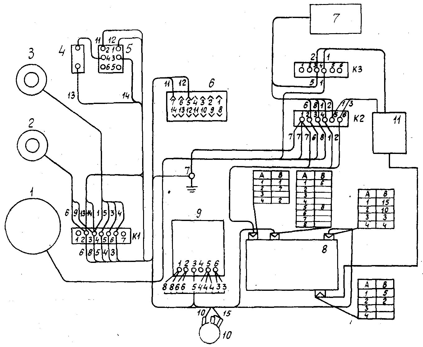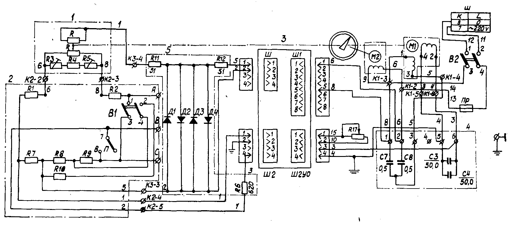 1 – реохорд; 2 – электродвигатель привода диаграммного диска; 3 – электродвигатель реверсивный; 4 – предохранитель; 5 – переключатель; 6 – разъем внешних соединений; 7 – измерительный блок; 8 – усилитель; 9 – блок конденсаторов; 10 – резистор R17; 11 – блок искрозащитный; А – контакт; В – жила.