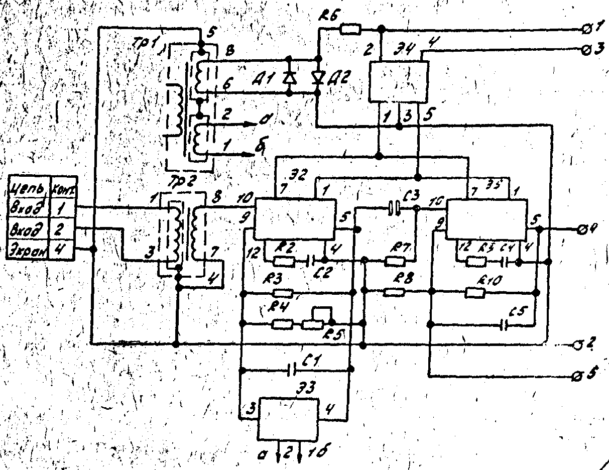 Сигнал переменного тока поступает с измерительной схемы прибора через штепсельный разъем Ш (контакты 1, 2) на первичную обмотку входного трансформатора Тр2. Входной трансформатор гальванически разделяет цепь датчика прибора и общую точку схемы усилителя.