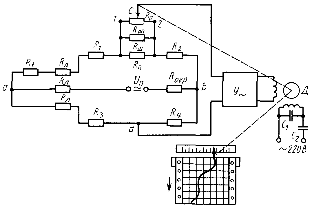 В автоматических уравновешенных мостах используется четырехплечная мостовая схема. На рис. 1 обозначены R>1>, R>2>, R>3>, R>4> – сопротивления плеч моста; R>t> – терморезистор; R>л> – сопротивление линии (место измерения температуры может находиться на значительном расстоянии от прибора); R>рп> – полное сопротивление реохорда; R>п> – сопротивление, определяемое пределом измерения моста; U>п >– напряжение источника питания; R>огр> – сопротивление, ограничивающее ток в плечах мостовой схемы.