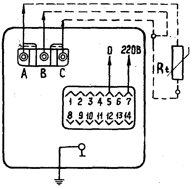 Прибор подключается к сети через плавкий предохранитель и двухполюсный выключатель. Заземление подключается к клемме «земля», расположенной на задней стенке прибора. Кабель термопреобразователя сопротивления присоединяется к клеммам блока А, В и С, выведенным на заднюю стенку корпуса прибора.