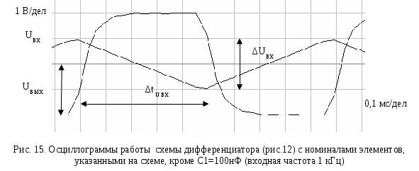 7. Переходный процесс в схеме дифференциатора на ОУ исследовался по схеме рис.12, полученные осциллограммы представлены на рис.13.