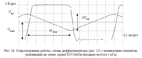В. U>ВЫХ >= - R>2>∙C>1>∙ ∆ U>ВХ> / ∆t = - R>2>∙C>1>∙V>U>> ВХ> = - 1В, что соответствует экспериментальным данным, показанным на рис.13.