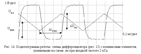 8. Для исследования влияния частоты входного напряжения, ее значение увеличено вдвое - 2 кГц (рис.14), следовательно, и скорость изменения входного напряжения (при той же амплитуде сигнала) увеличилась вдвое.