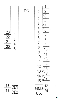По входам СЕ1 и СЕ2 даются сигналы разрешения выходов, чтобы устранять текущие выбросы, которыми сопровождается дешифрация кодов, появляющихся не строго синхронно. Чтобы разрешить прохождение данных на выходы, на входы СЕ1 и СЕ2 следует дать напряжение низкого уровня. Эти входы необходимы также при наращивании числа разрядов дешифрируемого кода. Когда на входах СЕ1 и СЕ2 присутствуют напряжения высокого уровня, на выходах 0-15 появляются высокие уровни.