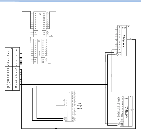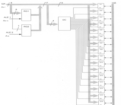 Шина данных (ШД) подключается к микросхемам памяти статических оперативно запоминающих устройств (СОЗУ). Сигнал ALE подключается к регистру.