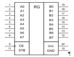 При поступлении на вход STB сигнала высокого уровня осуществляется нетактируемая передача информации от входа DI до выхода DO. При подаче на вход STB сигнала низкого уровня микросхема хранит информацию предыдущего такта; при подаче на вход STB положительного перепада импульса происходит "защелкивание" входной информации. Выходные буферы управляются сигналом ОЕ "разрешение выхода". При поступлении на вход ОЕ сигнала высокого уровня выходные буферы переводятся в состояние "выключено".