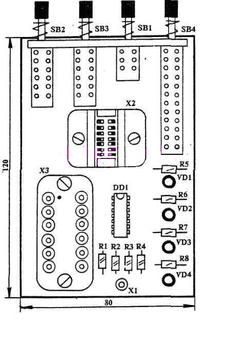 Рассмотрим процесс проверки микросхем подробнее. В исходном состоянии, когда ни одна клавиша переключателей не нажата, а в розетку Х2 не вставлена микросхема, светодиоды VD1 - VD4 должны светиться. Они через группу нормально замкнутых контактов SB4 подключены к инвертору DD1.