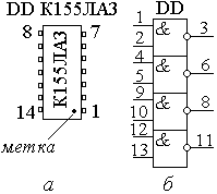 Внешний вид (а) и условное графическое обозначение (б) микросхемы К155ЛА3.