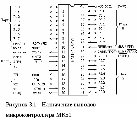 ОМЭВМ, назначение выводов которой представлено на рисунке 3.1 состоит из следующих основных функциональных узлов: блока управления, арифметико-логического устройства, блока таймеров/счетчиков, блока последовательного интерфейса и прерываний, .программного счетчика, памяти данных и памяти программ. Двусторонний обмен информацией между функциональными блоками осуществляется с помощью внутренней 8-разрядной магистрали данных. Разряды порта 3 микроконтроллера имеют двойную функцию, в зависимости от установленных режимов работы. Порт 3 может функционировать как обыкновенный параллельный 8-разрядный интерфейс, либо позволяет организовывать последовательный канал обмена данными и систему прерываний от внешних устройств, причём существует возможность задавать режим работы каждого разряда порта 3 в отдельности.