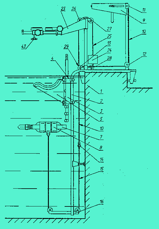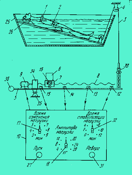 Среди изученных в процессе патентного поиска установок, особое внимание заслуживают те установки, которые имеют в своём составе систему управления нагрузкой.[4] Установка (рисунок 1.5) содержит фиксаторы 1 и пояс 2 пациента, трос 3, направляющие ролики 4, рычаг 5, груз 6, установленный на каретке 7 с реверсивным приводом, и пульт управления 10. Вдоль рычага 5 установлены герконы, на каретке - постоянный магнит 16, а на пульте управления - переключатели времени изменения нагрузки и ее амплитуды. Оба переключателя включены в цепь управления скоростью привода. Груз соответствует максимальной амплитуде нагрузки. В приводе может быть использован двигатель постоянного тока, либо шаговый двигатель. Установка применяется при вертикальном вытяжении в бассейне, либо при горизонтальном вытяжении в ванне, снабженной щитовым ложем. Установка работает следующим образом: Пациент помещается на основание 26 в ванной 25, на нём закрепляется фиксатор 1 и пояс 2. Медсестра устанавливает Параметры процедуры при помощи переключателей на передней панели. После нажатия кнопки «Пуск» начинается процедура. Устройство управления изменяет нагрузку посредством шагового двигателя 9, редуктора 34, винта 8, перемещает каретку 7 с грузом 6 относительно опоры 35 рычага 5. Положение груза оценивается при помощи герконов 15,14,13,12. Система позволяет без применения датчика усилия достаточно точно устанавливать предварительно рассчитанную величину нагрузки.