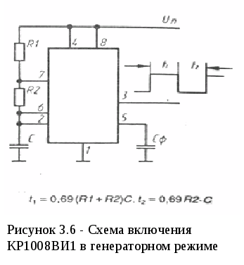 В устройстве управления использована возможность организации обработки прерывания от внешнего устройства для отсчёта секундных интервалов времени, что позволило сэкономить программную память и сосредоточить внимание программы на обработку показаний датчиков и работу с ЖК модулем. Для отсчёта секундных интервалов используется микросхема-таймер КР1008ВИ1 (рисунок 3.2), позволяющая задавать RC-цепочкой временные параметры генерируемого сигнала. Несмотря на отсутствие в схеме таймера кварцевого резонатора, RC-цепочка даёт стабильные колебания с достаточной для отсчёта времени процедуры точностью.