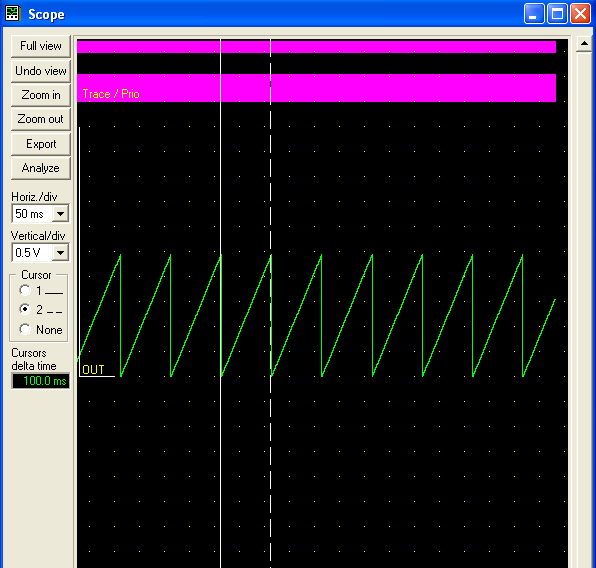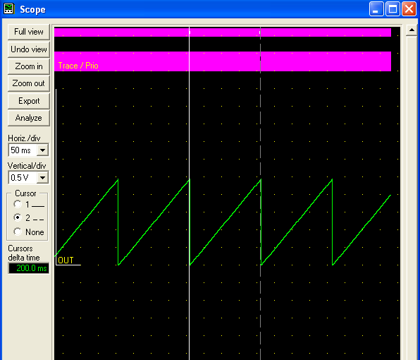 Проверка работоспособности устройства эмулировалась в программе VMLAB, позволяющей описать схему электрическую принципиальную устройства, ввести текст программы функционирования устройства, а также осуществить визуальный контроль над генерируемым сигналом и проверку работы устройства в различных режимах.