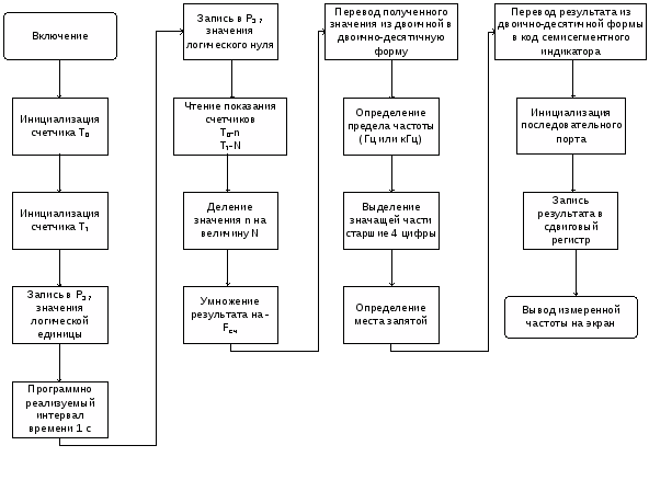 На выводе порта Р3.7 устанавливается значение логической единицы, т.е. формируются первые временные ворота. Затем выполняется программа формирования временной задержки длительностью 1 с. Во время этого интервала счетчики производят подсчет импульсов, поступающих на их входы. Содержимое двухбайтовых регистров Т0 и Т1 увеличивается. Если при высокой частоте количество импульсов, пришедших на вход счетчика Т0, превысит емкость регистра, то происходит выполнение обработки прерывания по переполнению и содержимое дополнительного регистра инкрементируется. Это позволяет микроконтроллеру произвести подсчет 224 импульсов. По прошествии одной секунды, на выводе Р3.7 устанавливается “0” и формирование временных ворот заканчивается. Счетчики прекращают счет. В результате получены значения числа импульсов n и N.