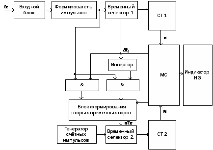 Фронт и срез образованных ворот синхронизированы с моментами появления импульсов периодической последовательности, сформированной из исследуемого сигнала, поэтому погрешность округления исключается. Вторые временные ворота заполняются счетными импульсами, число N которых фиксируется.