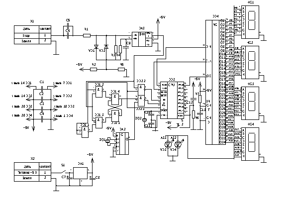 Кварцевый генератор счетных импульсов выполнен на основе интегральной микросхемы генератора импульсов КР531ГГ1. Частота работы микросхем этой серии – не более 50 МГц, напряжение питания +5 вольт, потребляемая мощность – не более 19 мВт. Вместо конденсатора, к входам генератора подключен кварцевый резонатор на 10 кГц, что обеспечивает высокую стабильность временных параметров счетных импульсов.