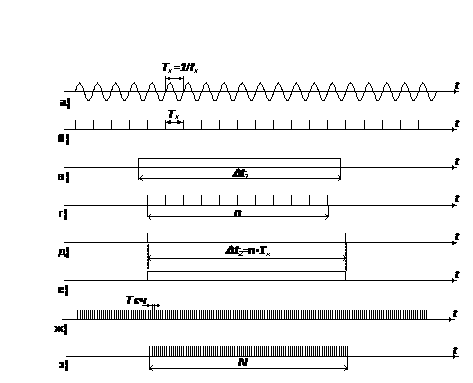Таким образом, на входе 2 временного селектора 2 получаются вторые временные ворота длительностью Δt>2>=nT>x>, через которые проходят счетные импульсы (ж). Попавшие в ворота импульсы подсчитываются счетчиком 2, на нем фиксируется их число N.