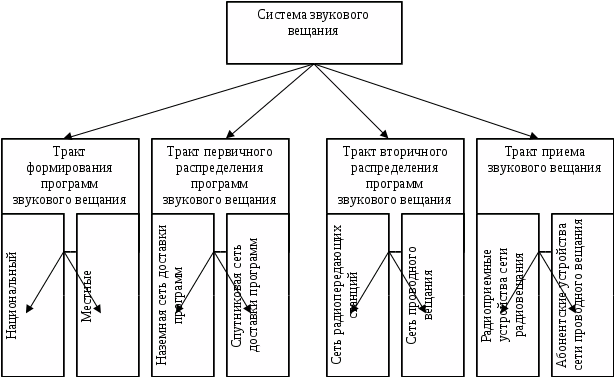 Система звукового вещания (см. рис.1.1) включает тракты формирования программ, их первичного (каналы доставки программ к радиовещательным станциям) и вторичного (сети радиовещательных станций и систем проводного вещания) распределения, а также и тракты приема программ радиовещания (радиоприемные и абонентские устройства слушателей).