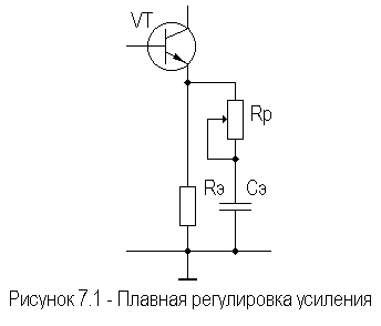 Обычно техническое задание на проектирование усилителя содержит требование обеспечить регулировку усиления в заданных пределах. Для реализации этого требования применяют схемы плавной и ступенчатой (или обе вместе) регулировок усиления. Наиболее часто в ШУ и ИУ плавная регулировка осуществляется путем введения последовательной ООС по току (рис.7.1).