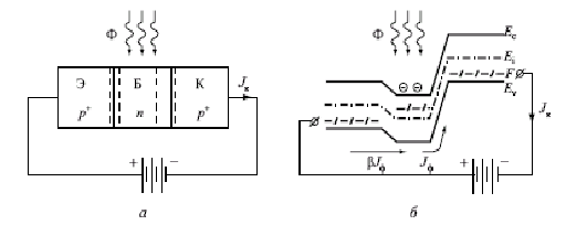 На рис. 2.1 показаны схема включения фототранзистора и зонная диаграмма в активном режиме работы.