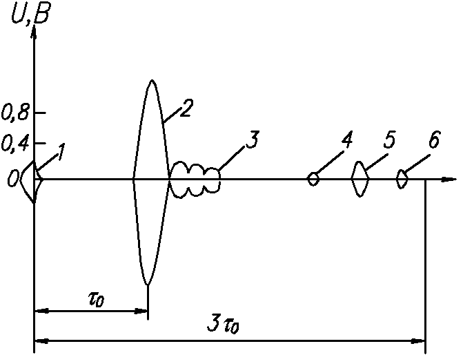 фильтрах на ПАВ эффект отражений стремятся уменьшить, для чего используют очень тонкие напыленные штыри, толщиной примерно 100 … 200 нм, а также подбирают соотношения между величинами a и h. Установлено, что целесообразно выбирать отношение a /(a+h), равное примерно 0,6 при материалах с небольшим значением kм и 0,7…0,8 - с большим kм.Характер отражения от других неоднородностей разнообразен. Для иллюстрации возможных причин отражений на рис.2 показаны ложные сигналы во временной области, возникающие при подаче δ-импульса на вход фильтра ПАВ. На рисунке: 1 - сигнал прямого распространения с практически нулевой задержкой; 2 - основной полезный сигнал ПАВ; 3 ― сигналы, многократно отраженные от штырей; 4 - сигналы, отраженные от поглотителей; 5 - сигнал, отраженный от левой кромки звукопровода; 6 - сигнал, отраженный от правой кромки звукопровода; τ0 ― время задержки основного сигнала при прохождении между ВШП.