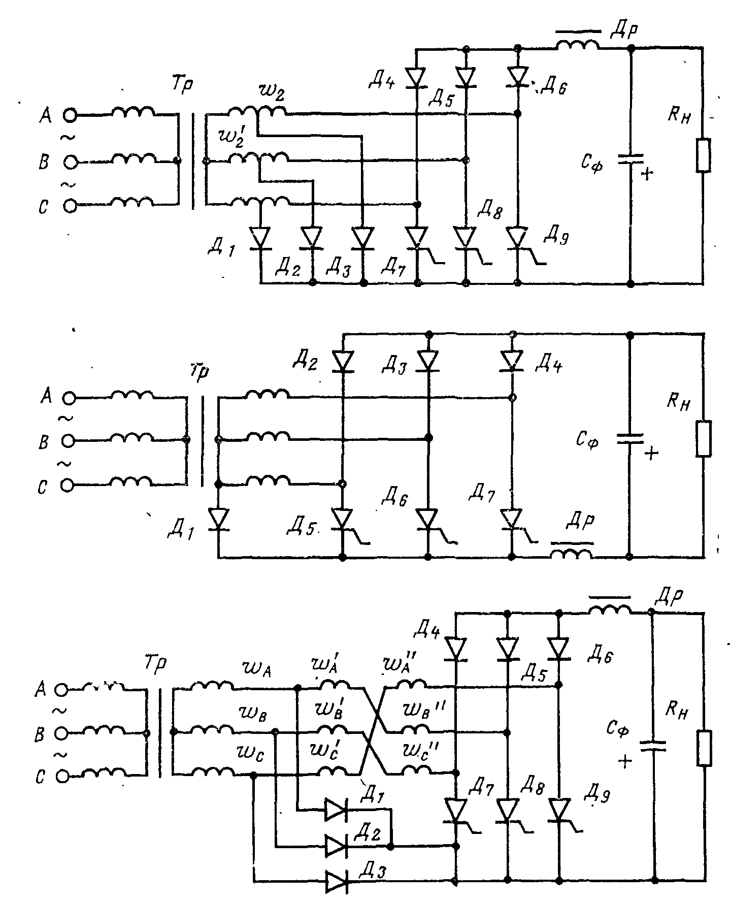 Регулируемыми выпрямителями называются преобразовательные устройства, совмещающие функцию выпрямления переменного напряжения с регулированием (или стабилизацией) напряжения на нагрузке. Простейшие схемы регулируемых выпрямителей образуются из соответствующих схем нерегулируемых выпрямителей при полной или частичной замене полупроводниковых выпрямительных диодов тиристорами.
