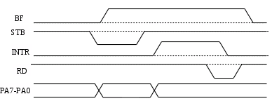 По переднему фронту импульса на линии STB A формируется сигнал BF (PC1) "буфер полон" который используется в качестве сигнала квитирования. По заднему фронту импульса STB A формируется сигнал INTR (PC0) который является сигналом прерывания.