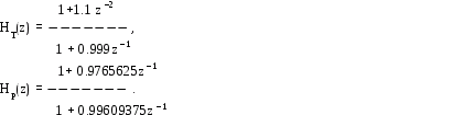 Разностное уравнение задает во временной области порядок получения выходной последовательности отсчетов из входной. В z-плоскости свойства цифрового фильтра описывает передаточная функция H(z), которая при двухкаскадной структуре и для приведенного выше разностного уравнения имеет вид: