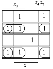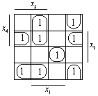Для заданої функції і для її заперечення знаходимо МДНФ за допомогою діаграми Кароно–Вейча.