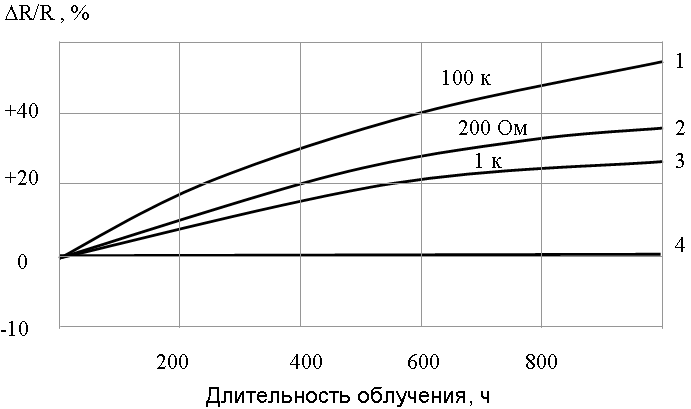 Облучение резисторов потоком быстрых нейтронов вызывает как необратимые, так и обратимые изменения (в зависимости от величины потока), а гамма - излучения - только обратимые изменения.