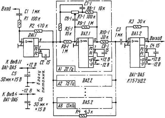 Приведу аналогичные схемы эквалайзера, компрессора и шумоподавителя. Схема еквалайзера представлена на рисунке 2.1.