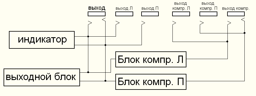 После этого сигнал проходит на выход и уровень сигнала показывается на стерео индикаторе на 5 делений. Так же этот сигнал поступает на компрессор.