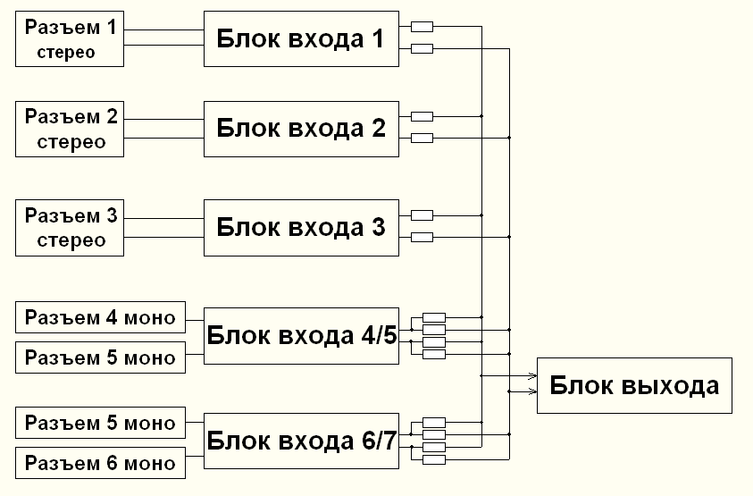 Для уменьшения влияния на блоки других входов, смешение осуществляется с помощью резисторов.