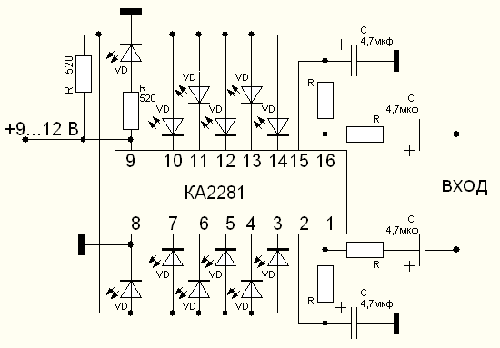 Для наблюдения за уровнем сигнала можно использовать схему стерео индикатора на микросхеме КА2281, к которой подключается 5 светодиодов на канал, и таким образом ведется наблюдение и регулирование сигнала, чтоб не допустить перегрузки
