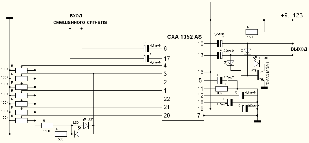 В этой микросхеме кроме активного эквалайзера на 5 полос регулировки от –14 дБ до 14 дБ, еще есть усилитель на 14 дБ, поэтому эту же схему можно использовать в качестве последнего каскада усиления для сложения сигналов.