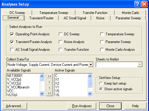 подключить к входам источники сигналов (для каждой цепи задать порт), в пункте меню Simulate выбрать Setup. После этого запустится симулятор и откроется окно настроек моделирования. Для начала симуляции необходимо задать необходимые настройки и нажать кнопку Run Analisys.