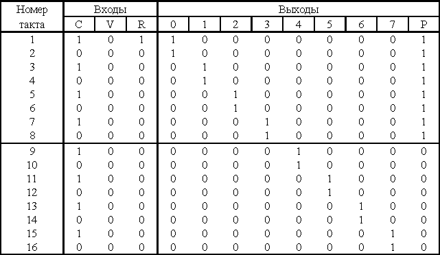 Так как всего может быть 8 наборов сигналов СХ>1>Х>2>, в первичной таблице будет 8 столбцов и 16 строк с устойчивыми состояниями. На первом шаге этапа в первичную таблицу переходов заносим все устойчивые состояния, соответствующие всем наборам входных сигналов.