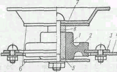 1—резиновая шайба; 2—поверхность резиновой шайбы, воспринимающая ударные перегрузки; 3—пластина; 4—основание, на котором закреплен аппарат; 5 — втулка; 6—ограничительные шайбы (ограничивают деформацию и предотвращают разрушение амортизатора при больших нагрузках); 7 — футляр аппарата; 8 — втулка, увеличивающая рабочий ход амортизатора