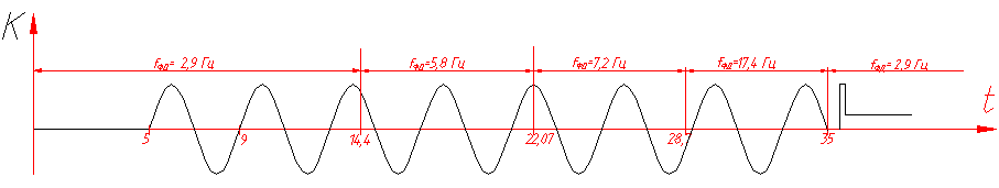 Команда К – закон изменения длительностей координатных интервалов t, t1, t2, с учетом изменения частот f>ФД> в интервале от 2,9 до 17,4 Гц (см. «Эпюры сигналов» и рисунок 4.4).