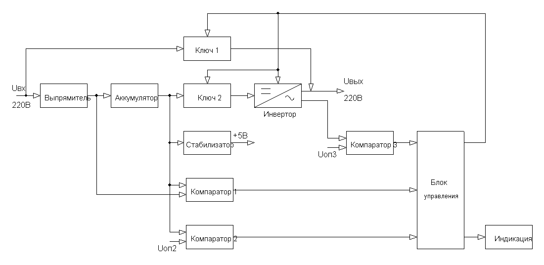 - компаратор 3 – в аварийном режиме выполняет сравнение уровня пониженного напряжения с выхода инвертора и фиксированного значения Uоп3, в случае, если напряжение на выходе инвертора меньше - вырабатывается управляющий сигнал, который соответствует режиму при котором ИБП не обеспечивает заданное значение на выходе источника (напряжение источника меньше допустимого значения);