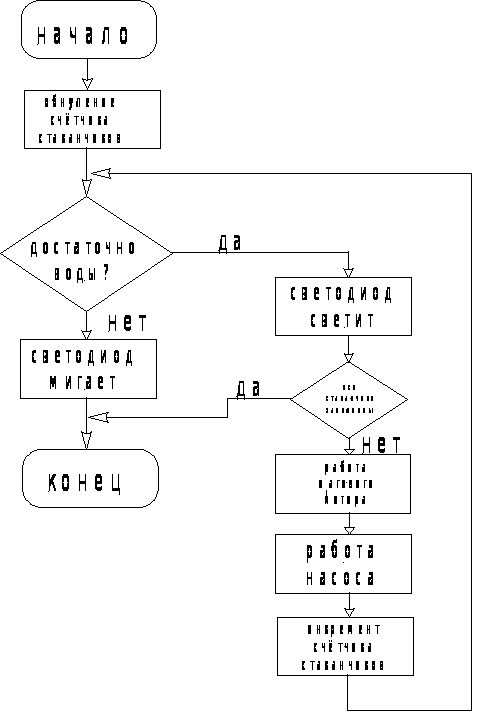 В данной курсовой работе проводится описание поэтапной разработки аппарата по розливу воды в стаканчики. Работа включает в себя разработку структурной схемы системы, выбор элементной базы, с описанием отдельных элементов системы, в том числе микроконтроллера. На основе выбранных элементов происходит построение функциональной схемы системы. Проводится разработка алгоритма работы системы и программного кода. В результате получили систему управления аппарата по розливу воды в стаканчики.