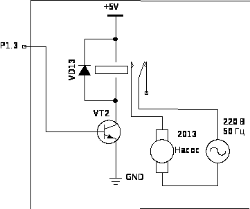 Запуск насоса осуществляется с помощью подачи сигнала логического нуля на порт Р1.3, выдерживается необходимая пауза с помощью процедуры таймера и сигнал с порта снимается.