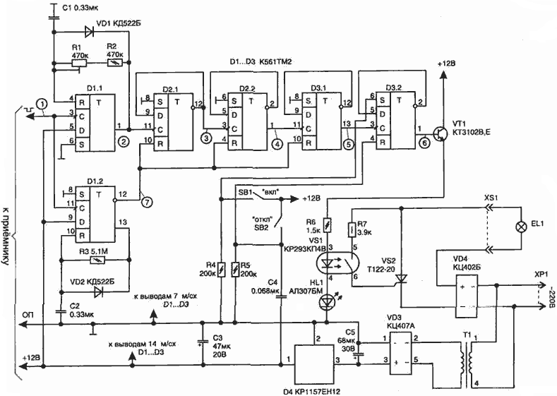 Принципиальная схема узла управления приведена на рис.5. Он собран на трех КМОП микросхемах и состоит из формирователя широких импульсов (D1.1), селектора двухсекундного временного интервала (D1.2) и двоичных счетчиков на элементах триггеров D2...D3. Кнопки SB1 и SB2 позволяют включать и выключать нагрузку без пульта ДУ.