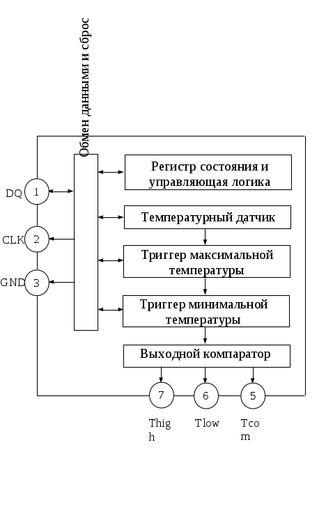 Передача данных от микросхемы к внешнему устройству осуществляется по трехпроводной последовательной шине: СLK/СОNV (контакт 2), DQ (контакт 1) и RЕSЕТ (контакт 3). Эти выходы совместимы с уровнями ТТЛ. Тhigt (контакт 7) – выход триггера высокой температуры. Если температура превышает установленный верхний порог, то выход Тhigt сигнализирует об этом высоким уровнем и остается в таком состоянии до тех пор, пока температура не упадет ниже заданного порога. Тlow (контакт 6) – выход триггера низкой температуры. Если температура опускается ниже определенного нижнего предела, то на нем появляется сигнал высокого уровня, сохраняющийся до тех пор, пока температура не поднимется выше указанного предела. Тсоm (контакт 5) – это выход комбинированного триггера высокой и низкой температуры. Тсоm=1, когда температура превышает верхний предел, Тсоm=0, когда она опускается ниже нижнего предела. Контакты 4 и 8 соединены с отрицательным и положительным проводами источника питания. Потребляемый ток в режиме ожидания равен 1 мкА, в рабочем режиме - 1 мА.