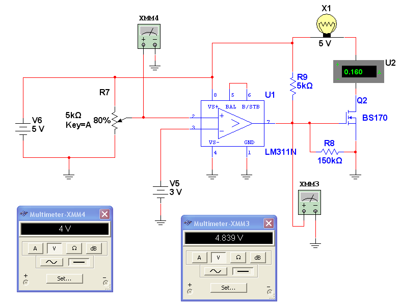 Опорна напруга 4 В. На виході компаратора приблизно 5 В (логічна одиниця). Це призводить до відкриття польового транзистору. Це в сою чергу призводить до перемикання реле. Як ми бачимо, лампочка світиться. У колі стоку тече струм.