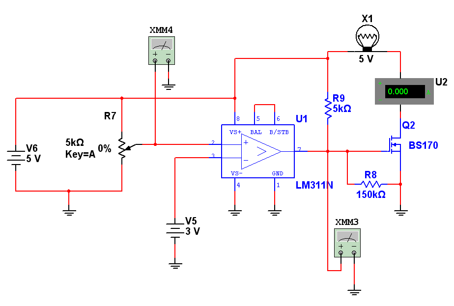 Далі приведена схема пристрою для моделювання без схеми під’єднання до АЦП. Як виявилось у пакеті моделювання Multisim 10 відсутня діюча модель реле, яка б була зручною для нас. Саме тому для моделювання було вирішено замість реле використовувати лампочку. Якщо лампа горить, то через неї тече струм і це означає що реле спрацювало і перемкнулось у інший стан. Це означає що напруга на (+) вході компаратора більша ніж напруга, яка поступає від датчика на (-) вхід компаратора Допоміжним засобом індикації буде амперметр у колі стоку транзистора.