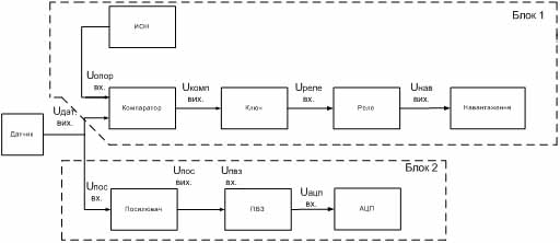 Дана схема буде складатися з двох основних функціональних блоків. Вони будуть повністю незалежними від роботи друг-друга. Єдине від чого вони будуть залежати, так це від функціонування датчика. Перший блок буде вмикати / вимикати навантаження, а інший підготовлювати сигнал до входу в АЦП.